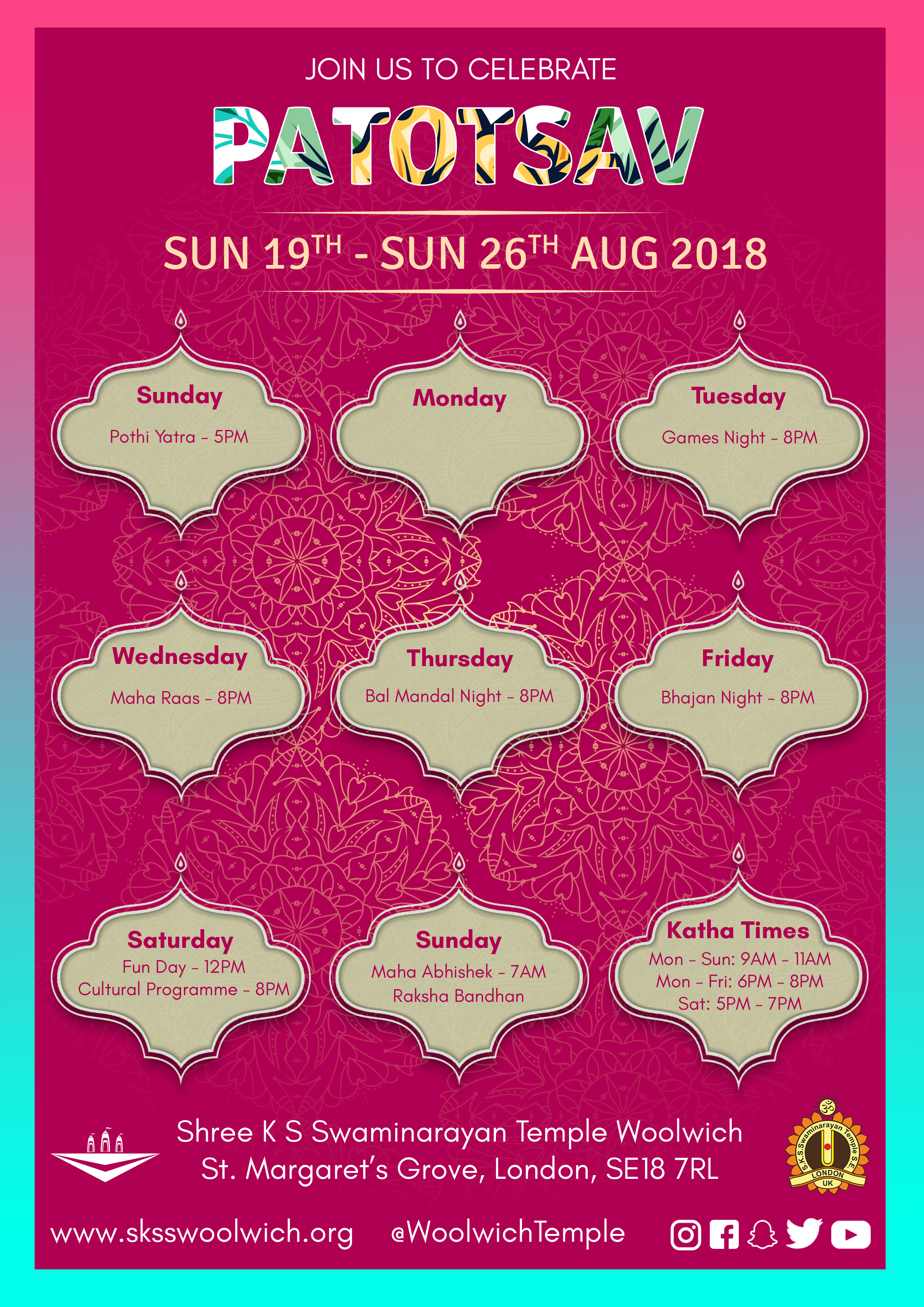 Shree Swaminarayan Temple Woolwich will be celebrating their 30th Patotsav celebrations and 1st Patotsav of Shree Ghanshyam Maharaj from Monday 20th August to Sunday 26th August 2018. Maha Abhishek of Ghanshyam Maharaj will be performed on Sunday 26th August from 7:00AM onwards followed by Ankoot.